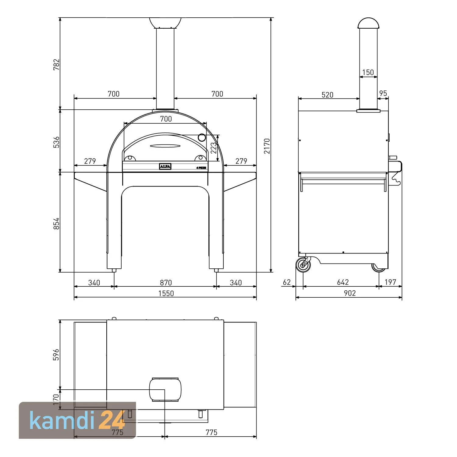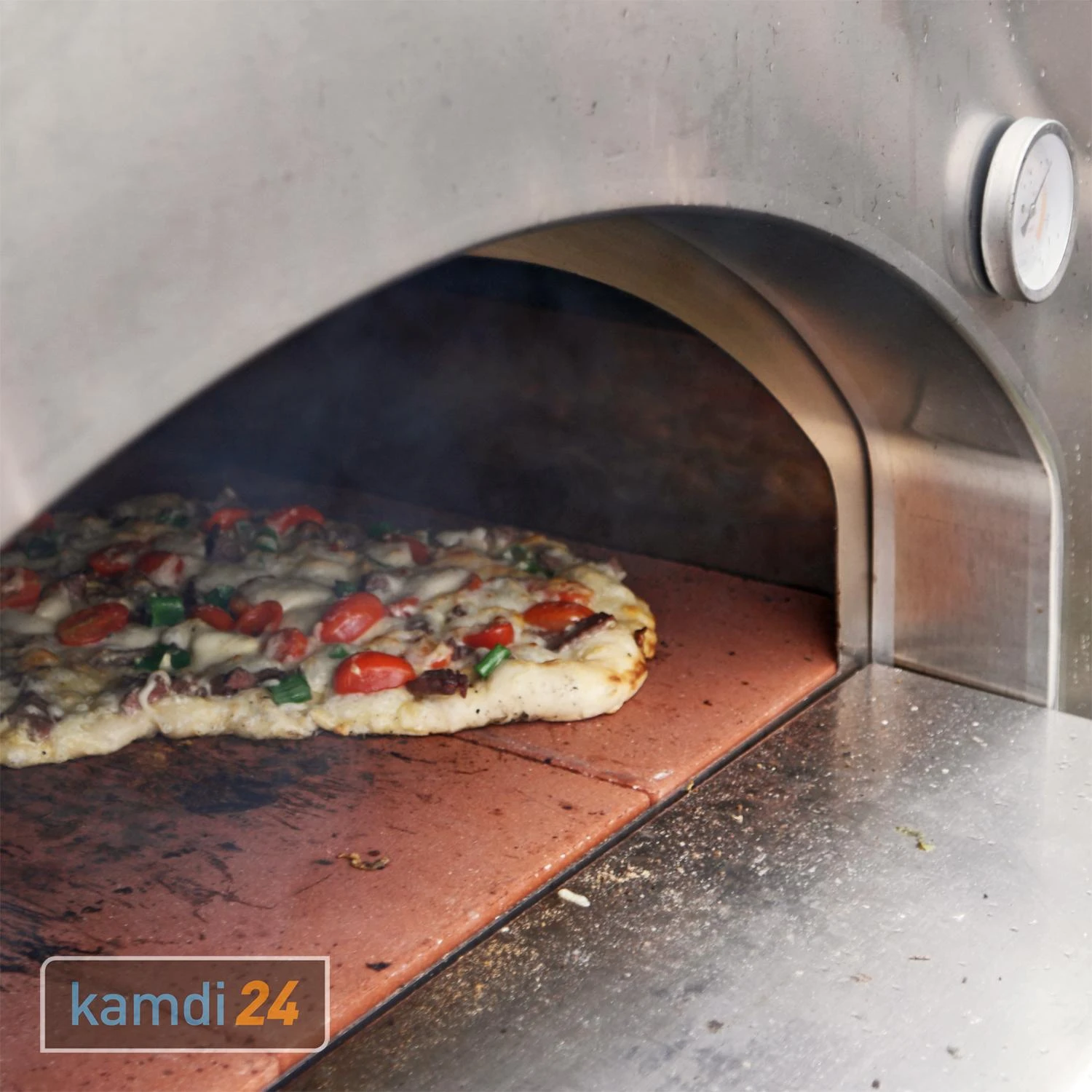 Damit Sie die Tür angenehm öffnen können, ist sie mit zwei Griffen versehen. Weiterhin verfügt der über einen integrierten Halter für die Pizzaschaufel und zwei seitliche Abstellflächen aus Edelstahl. So haben Sie das benötigte Arbeitsmaterial stets griffbereit. Auf dem praktischen Untergestell steht der schicke Pizzaofen sicher und kann dank der integrierten Räder leicht bewegt werden.