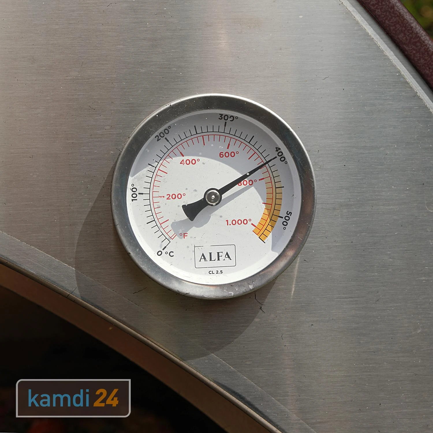 Die Edelstahlkuppel sorgt für eine kurze Aufheizzeit und eine gute Isolierung. Durch die gebogene Form verteilt sich die Wärme in dem schönen Gartenofen gleichmäßig und lässt Ihre Gerichte perfekt werden.
