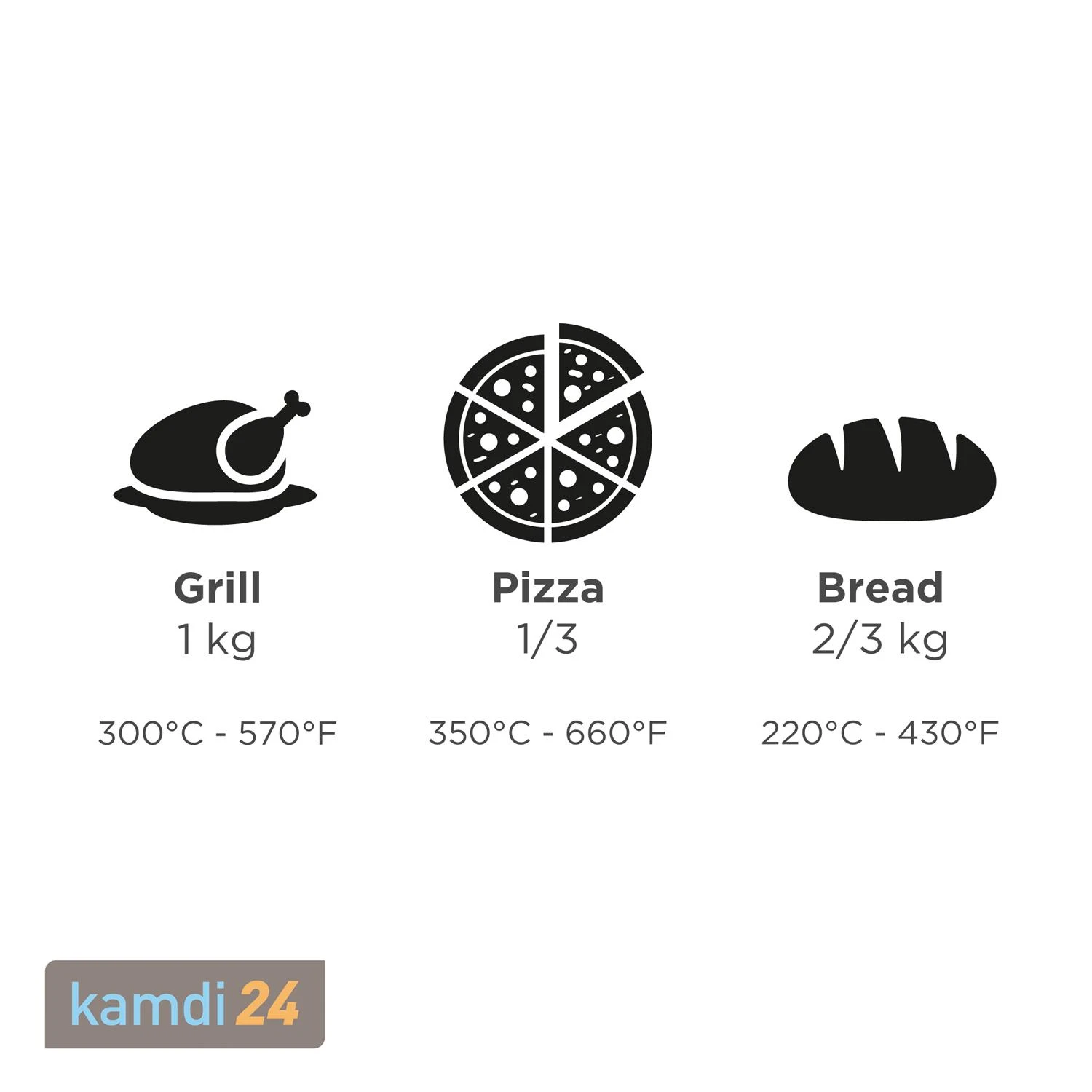 Der Backraum ist groß genug, um zwei Pizzen gleichzeitig zu backen. Durch die hervorragende Hitzeverteilung im Ofen und das qualitativ hochwertige Material ist die perfekte Pizza innerhalb von sehr kurzer Zeit zubereitet. Ein Backvorgang dauert ungefähr 90 Sekunden – nur gegessen wird sie noch schneller.