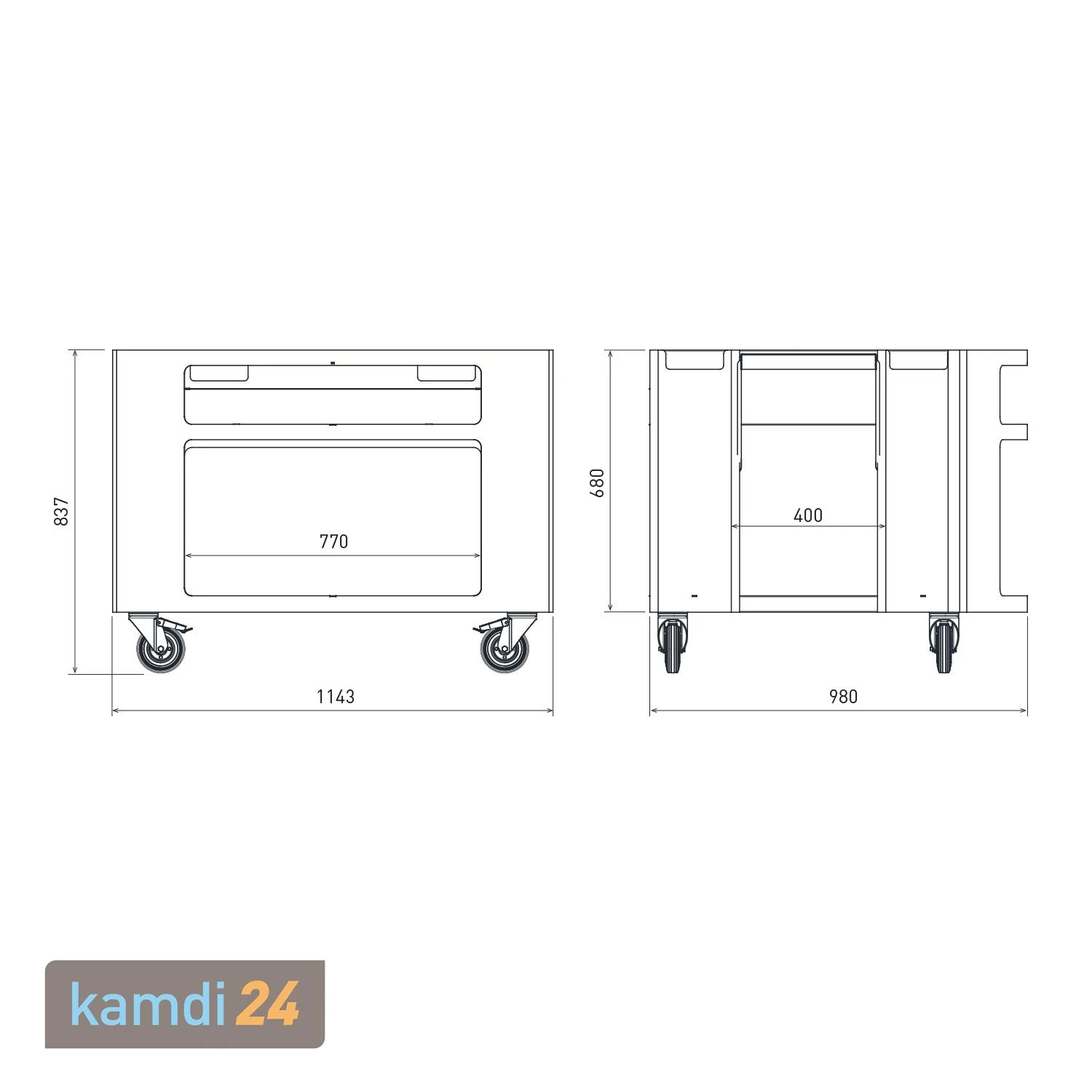 Direkt unter der Brennkammer befindet sich ein für die gebackenen Pizzen oder das Geschirr. Zusätzlich verfügt der über , die freistehend und arretierbar sind – das Verschieben des an beliebigen Standorten ist damit problemlos möglich.