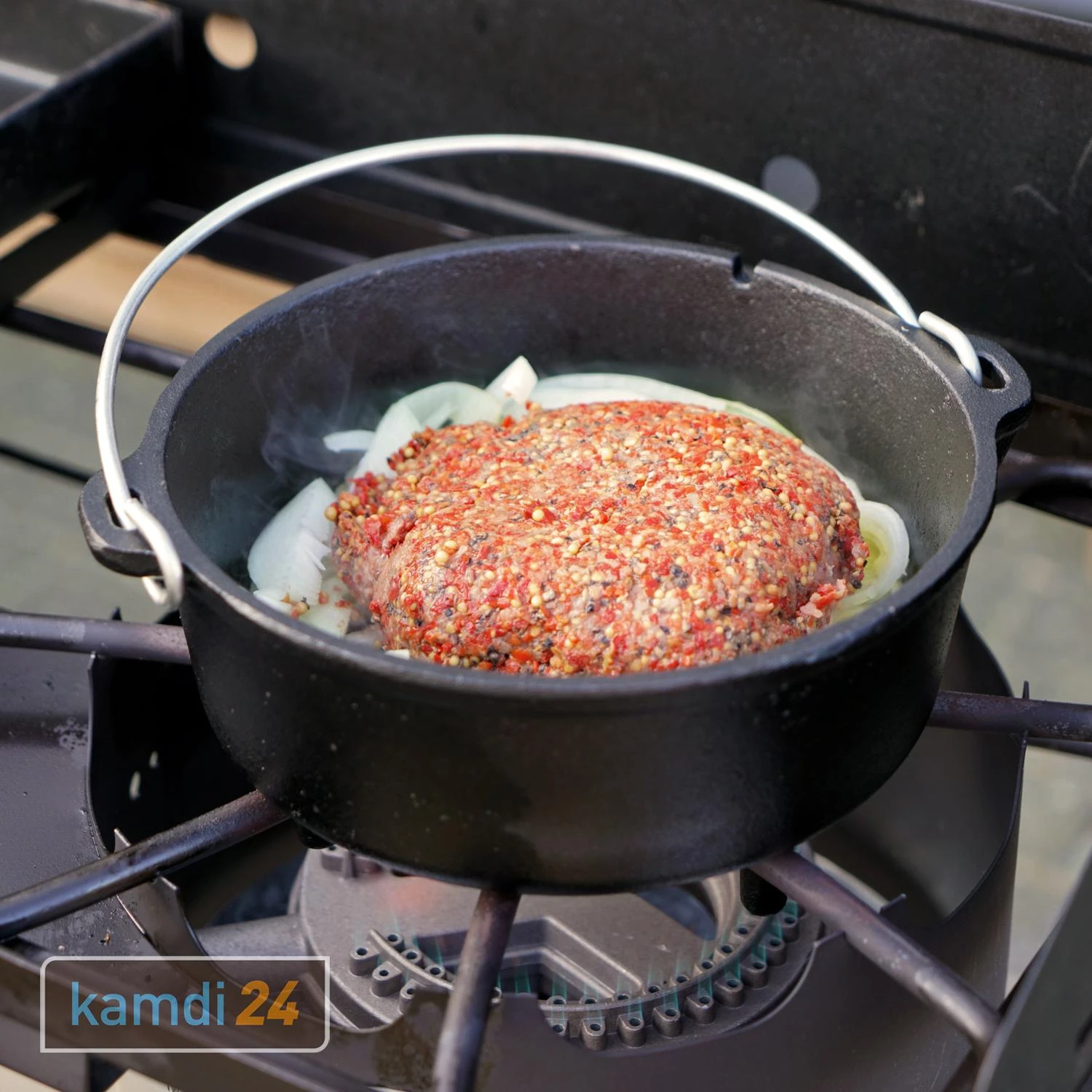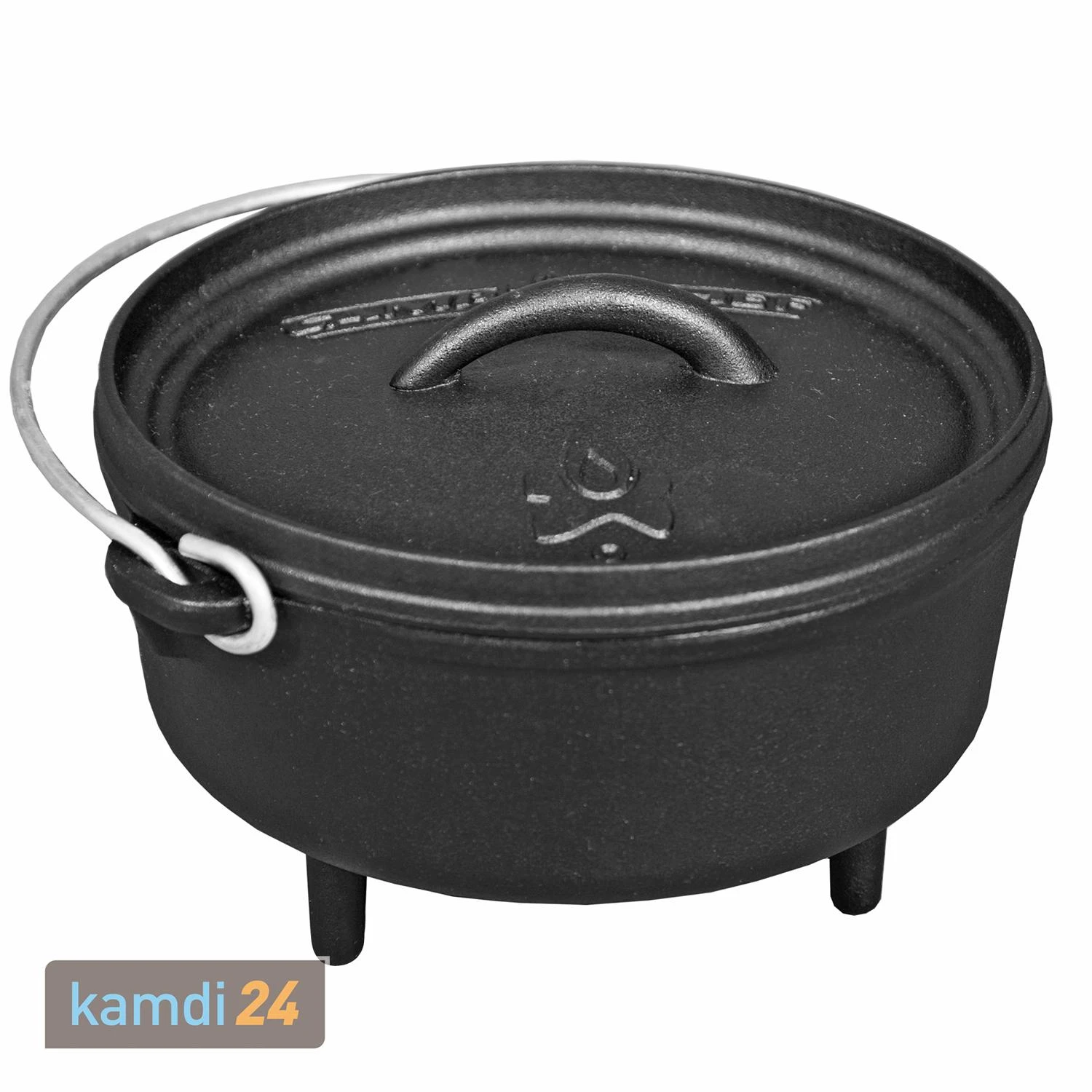 Der eignet sich nicht nur zur Zubereitung von Suppen oder Eintöpfen – Sie können darin nahezu alle denkbaren Gerichte kochen, braten, backen oder grillen. Der dicht schließende Deckel ermöglicht einen Backofen- und Schnellkochtopf-Effekt, wenn Sie darauf glühende Kohlen platzieren. Die gleichmäßige Wärmeverteilung in den massiven Gusseisen-Wänden sorgt für kurze Garzeiten.