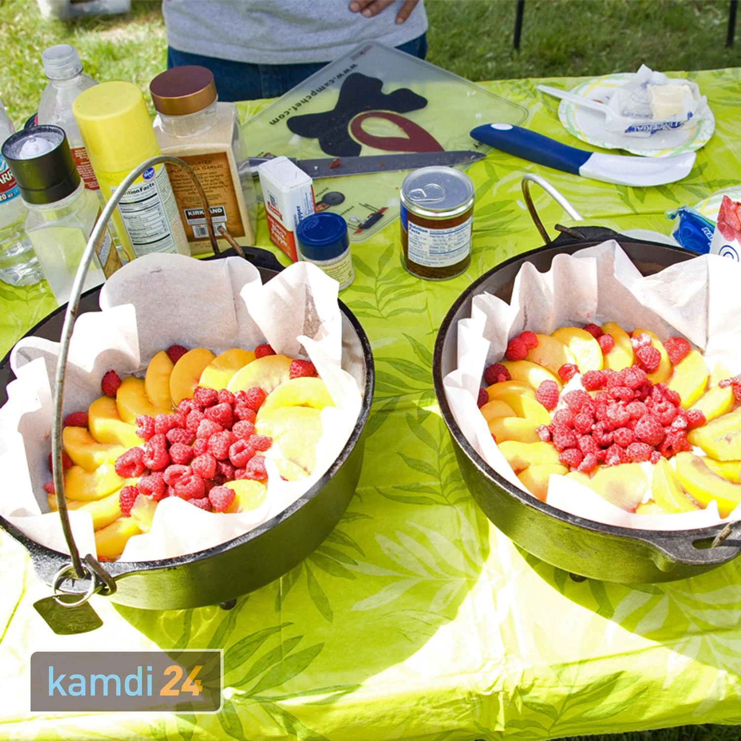Der eignet sich nicht nur zur Zubereitung von Suppen oder Eintöpfen – Sie können darin nahezu alle denkbaren Gerichte kochen, braten, backen oder grillen. Der dicht schließende Deckel ermöglicht einen Backofen- und Schnellkochtopf-Effekt, wenn Sie darauf glühende Kohlen platzieren. Die gleichmäßige Wärmeverteilung in den massiven Gusseisen-Wänden sorgt für kurze Garzeiten.