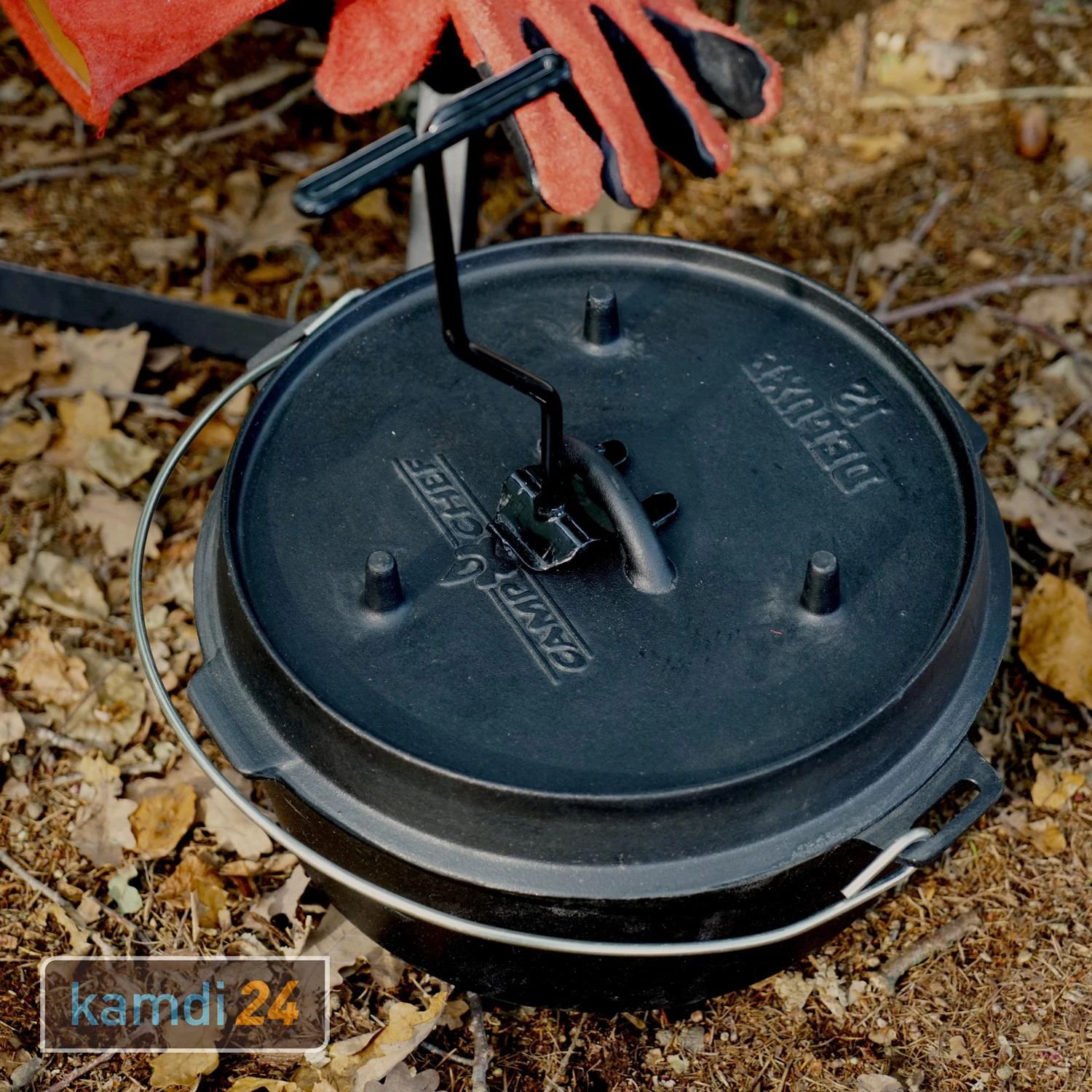 Mit dem Deckelheber können Sie den gusseisernen Deckel anheben, ohne diesen zu kippen. So gelangt keine Asche in den Topf, auch wenn Sie auf dem Deckel Kohlebriketts angeordnet haben. In der Deluxe-Serie ist der nützliche Deckelheber inklusive.