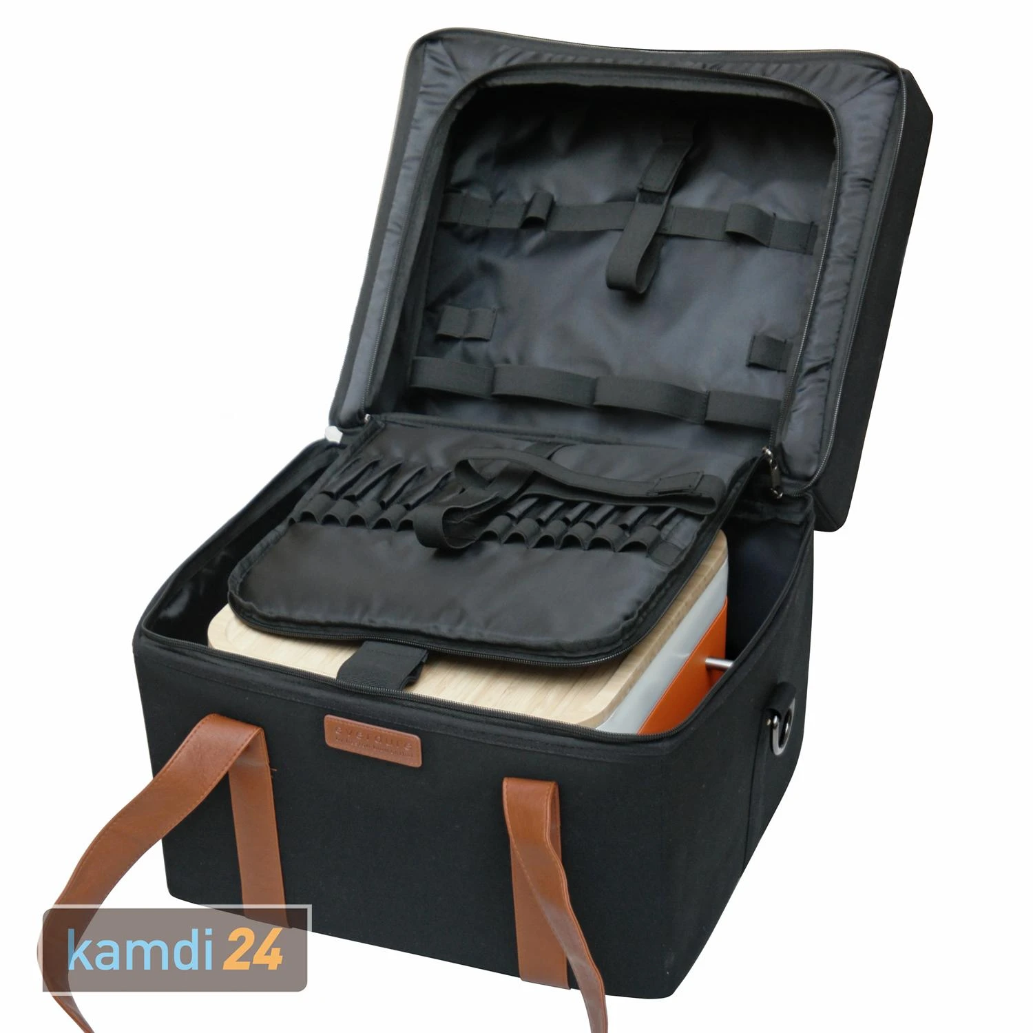 Die besteht aus schwarzem Segeltuch und ist mit braunen PU-Lederriemen ausgestattet. Sie kann wahlweise in der Hand oder mittels Schultergurt getragen werden. Ein Aufbewahrungsfach in der Tragetasche bietet großzügigen Stauraum. Klettverschlüsse sorgen für einen sicheren Halt von CUBE™ in der Tasche. Ein Zugbeutel für die Aufbewahrung von benutztem Geschirr ist inklusive.