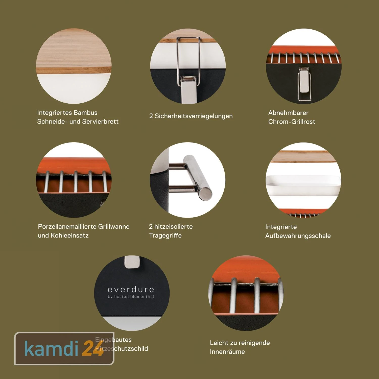 CUBE™ überzeugt nicht nur mit seinem schicken Retro-Design, sondern auch mit dem clever integrierten Zubehör. Das Bambus-Brett, das während des Transports den Grill sicher verschließt, dient als Schneide- oder Servierbrett. Zudem ist eine Aufbewahrungsschale untergebracht, in welcher Sie Kohle, Grillgut oder Zubehör zwischenlagern können.
