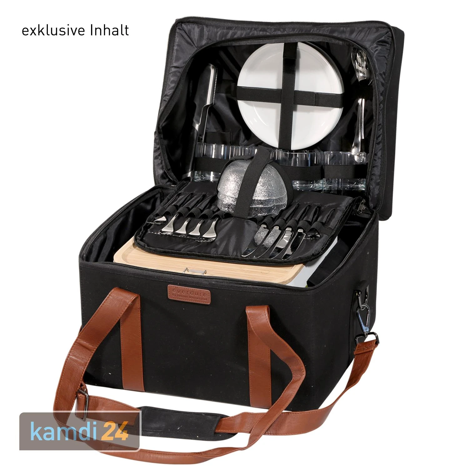 Ein weiteres Fach im Deckel der Transporttasche bietet ausreichend Platz für Besteck, Becher und Teller. Dank zahlreicher Gummischlaufen ist das gesichert und kann während des Transports nicht umherrutschen.