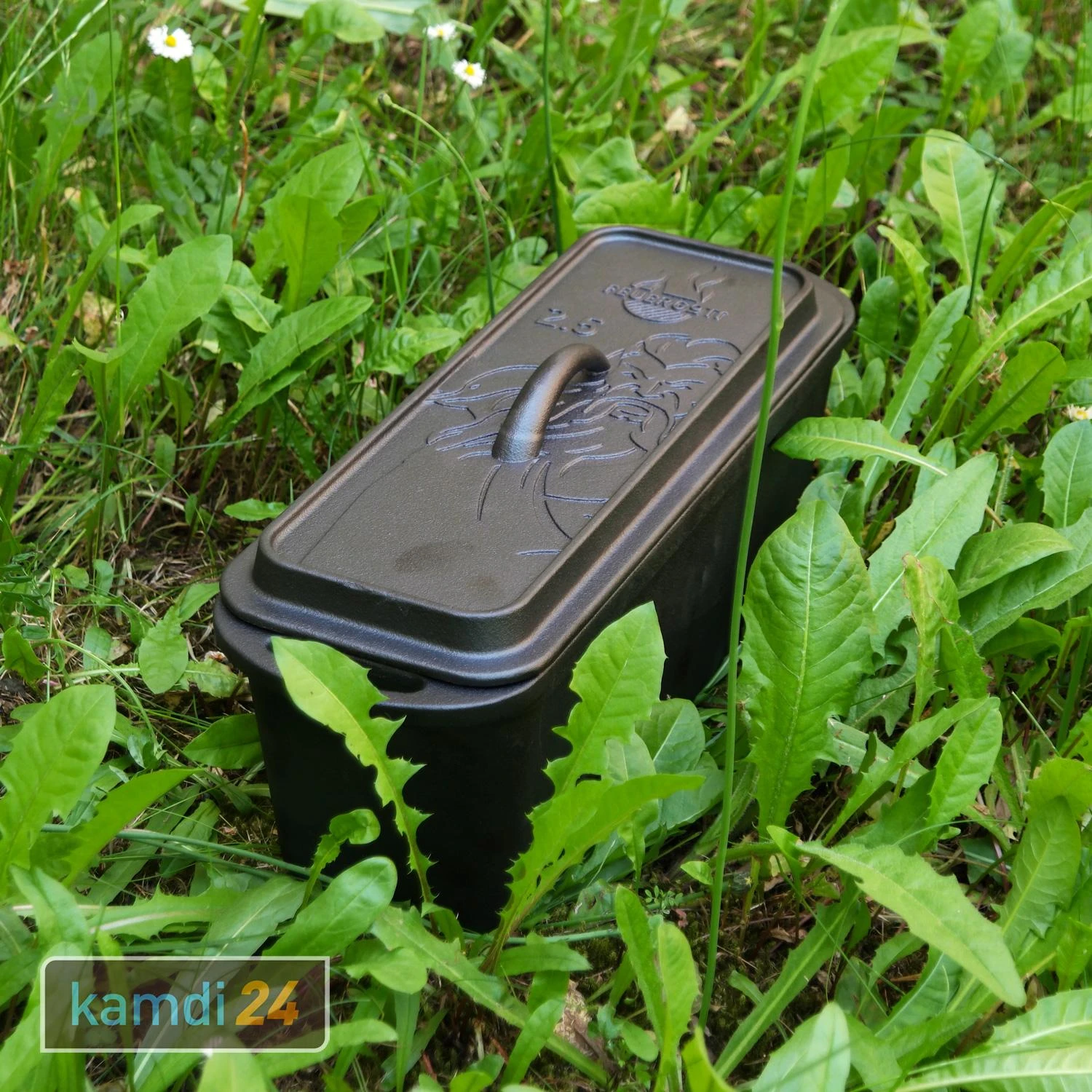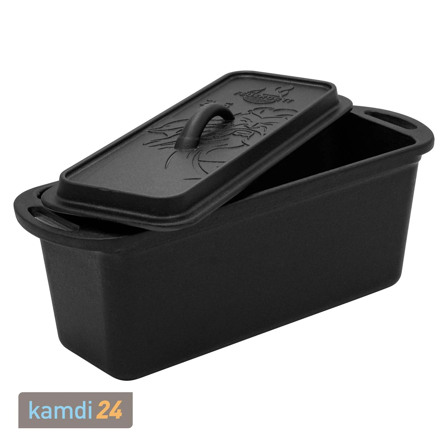 Die Kastenform eignet sich nicht nur zur Zubereitung von Backwaren. Sie können darin nahezu alle denkbaren Gerichte kochen, braten oder backen. Der dicht schließende Deckel ermöglicht einen Backofen- und Schnellkochtopf-Effekt, wenn Sie darauf glühende Kohlen platzieren. Die gleichmäßige Wärmeverteilung in den massiven Gusseisen-Wänden sorgt für kurze Garzeiten.