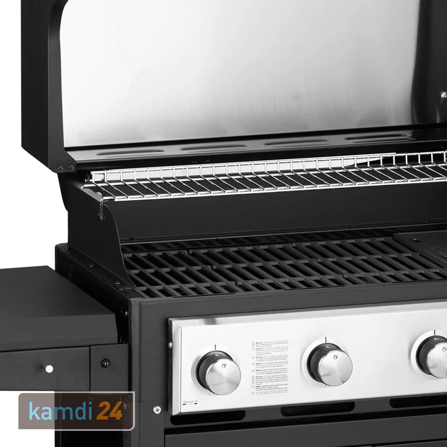 Genießen Sie unbeschwerten und leckeren Grillspaß mit dem von . Ausgestattet mit vier Hauptbrennern heizt dieses Gerät Ihrem Grillgut auf den drei Grillrosten sowie der praktischen Grillplatte ordentlich ein. Und während die Hauptspeise auf dem Rost brutzelt, bereiten Sie auf dem zusätzlichen 4,4 kW Seitenkocher leckere Beilagen wie Nudeln, Suppen, Eintöpfe oder auch passende Soßen zu. Ist der nicht in in Benutzung können die beiden Seitenteile einfach eingeklappt werden. Im geräumigen Unterschrank bietet jede Menge Stauraum für und eine Gasflasche bis 5 kg.
