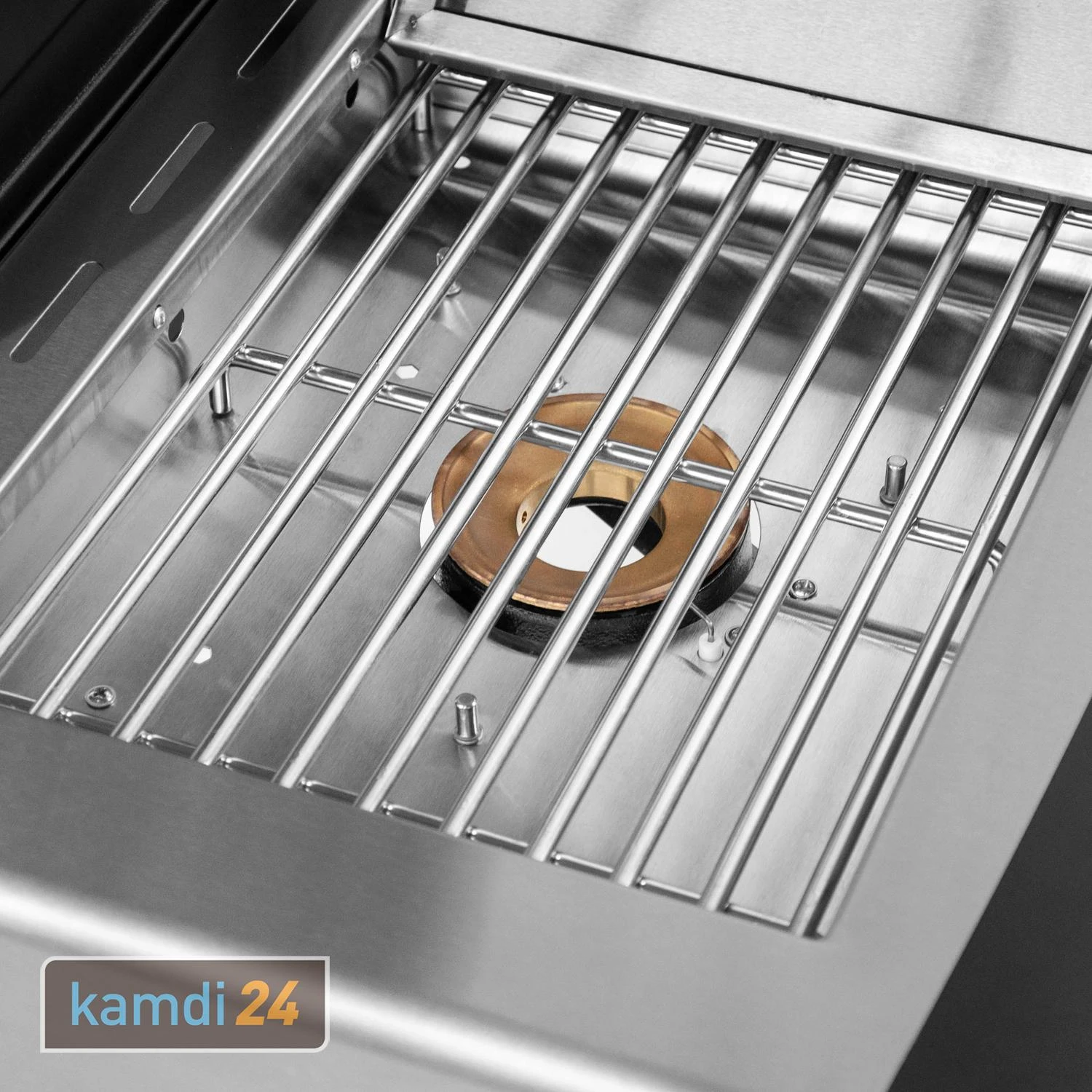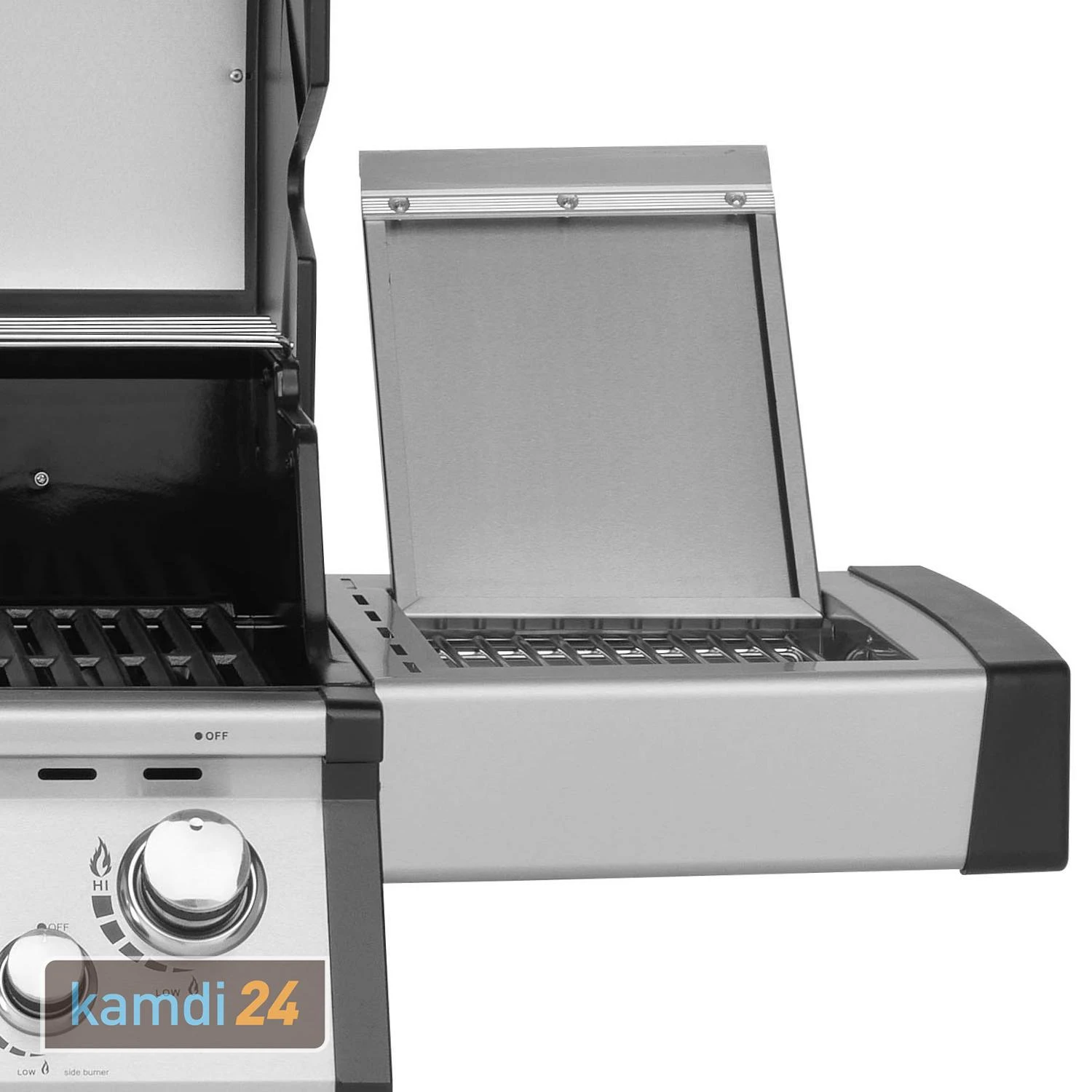 Nutzen Sie den integrierten Seitenbrenner mit einer Leistung von 3,5 kW zur Zubereitung von Soßen oder Beilagen. Im geschlossenen Zustand dient der Seitenbrenner als praktischer Ablagetisch.