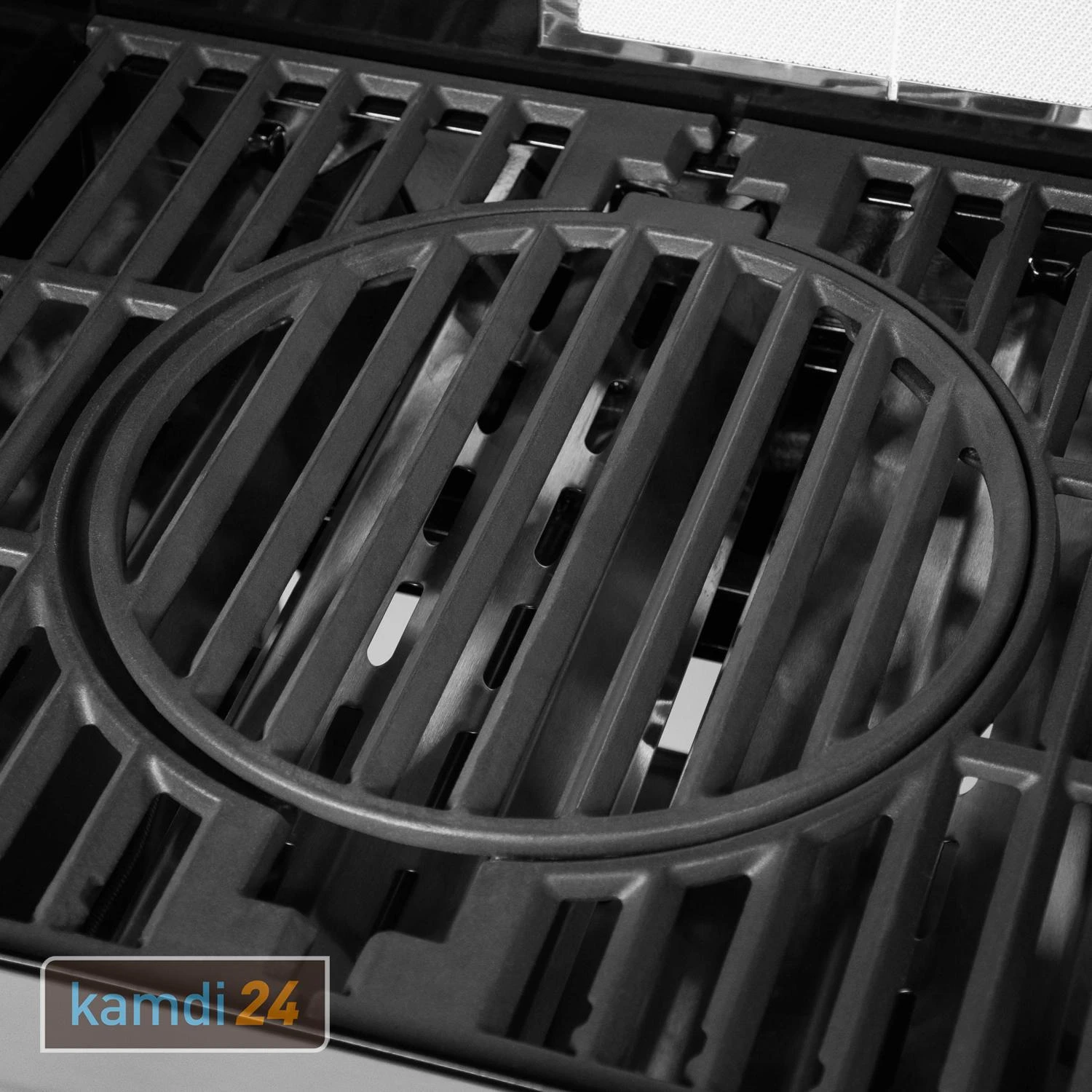Der 3-teilige Grillrost aus Gusseisen verfügt über eine hervorragende Wärmeleitfähigkeit, sodass das Grillgut an allen Stellen des Rostes gleichmäßig gegart wird. Zudem ermöglicht der Multifunktionsbereich den kinderleichten Einsatz von wie beispielsweise einem .