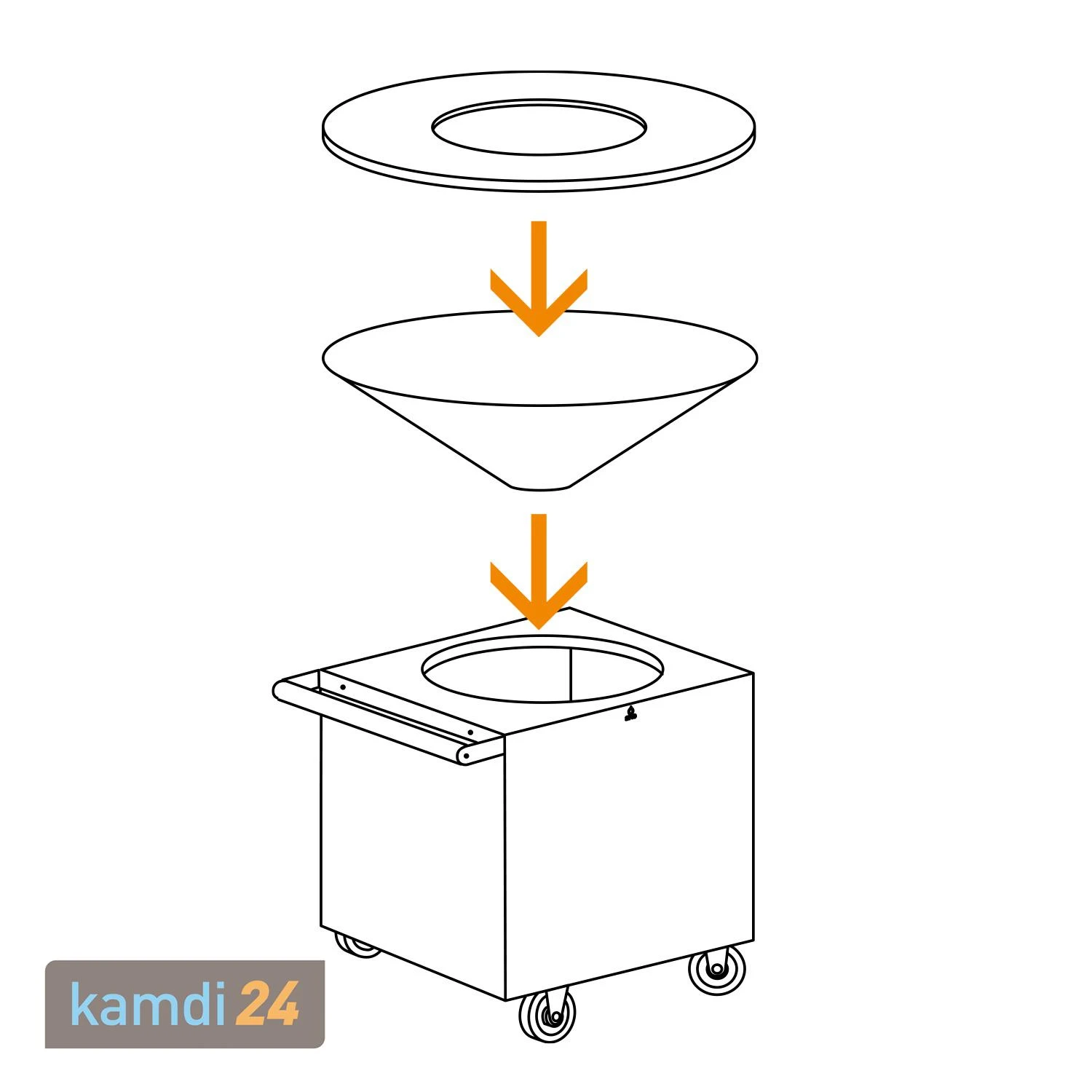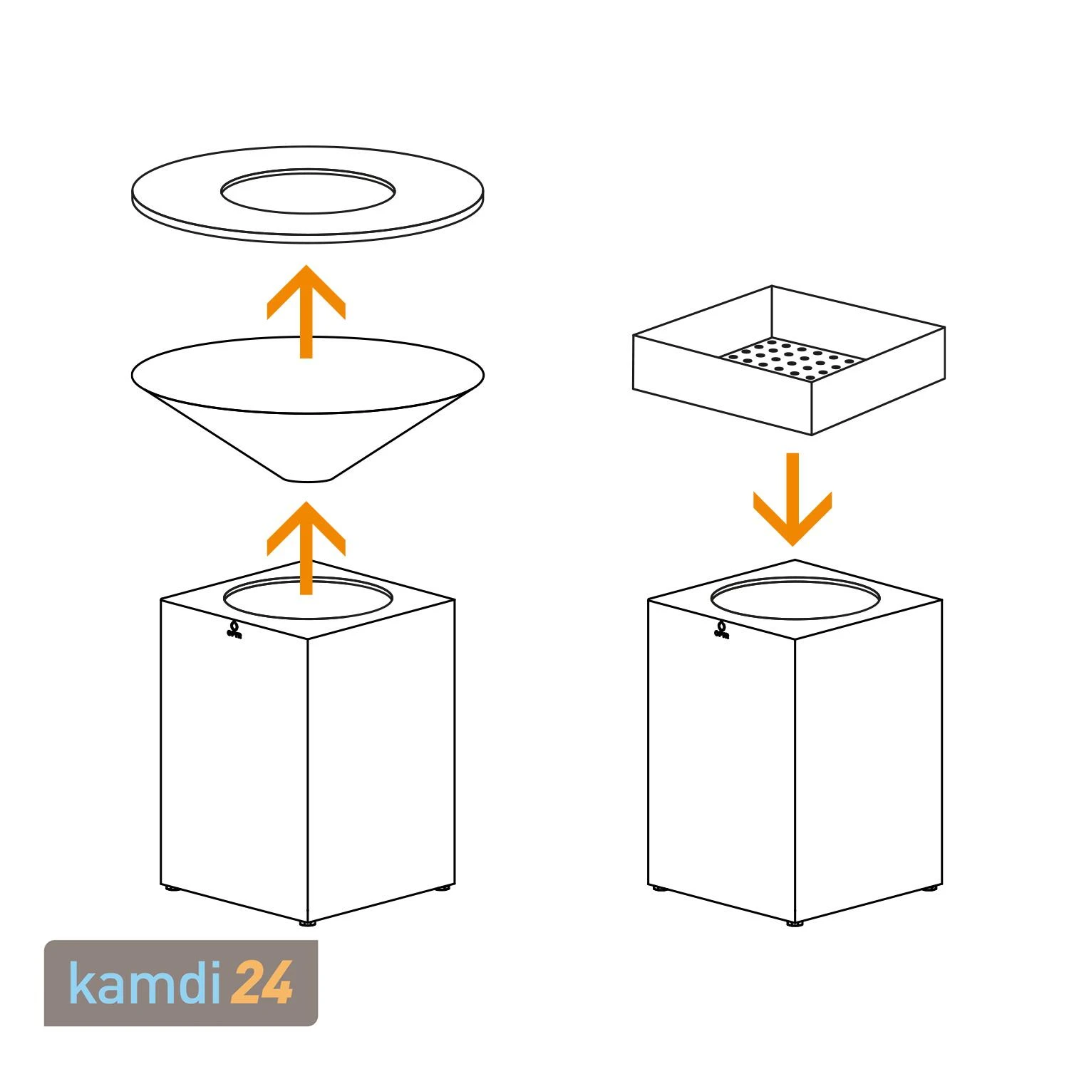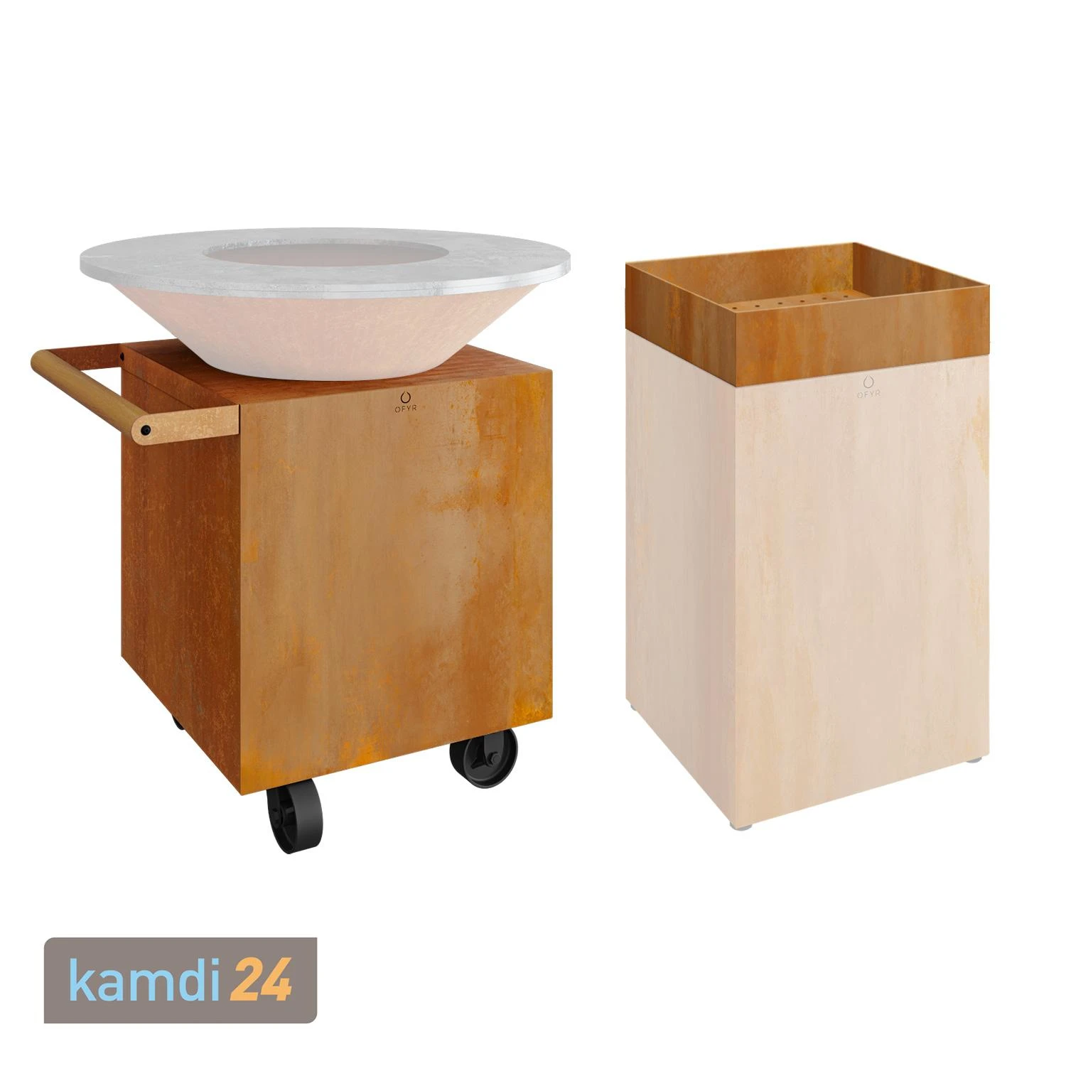 Der Sockel besteht aus hellem Cortenstahl, dessen Oberfläche und Farbe sich mit der Zeit immer weiter verändern. Aufgrund der Korrosion kann es in Verbindung mit Wasser zu Flecken auf hellen Stein- und Holzoberflächen kommen sowie zu sichtbaren Fettspritzern vom Grillen. Bei Nichtverwendung wird eine Lagerung im Innenbereich empfohlen.