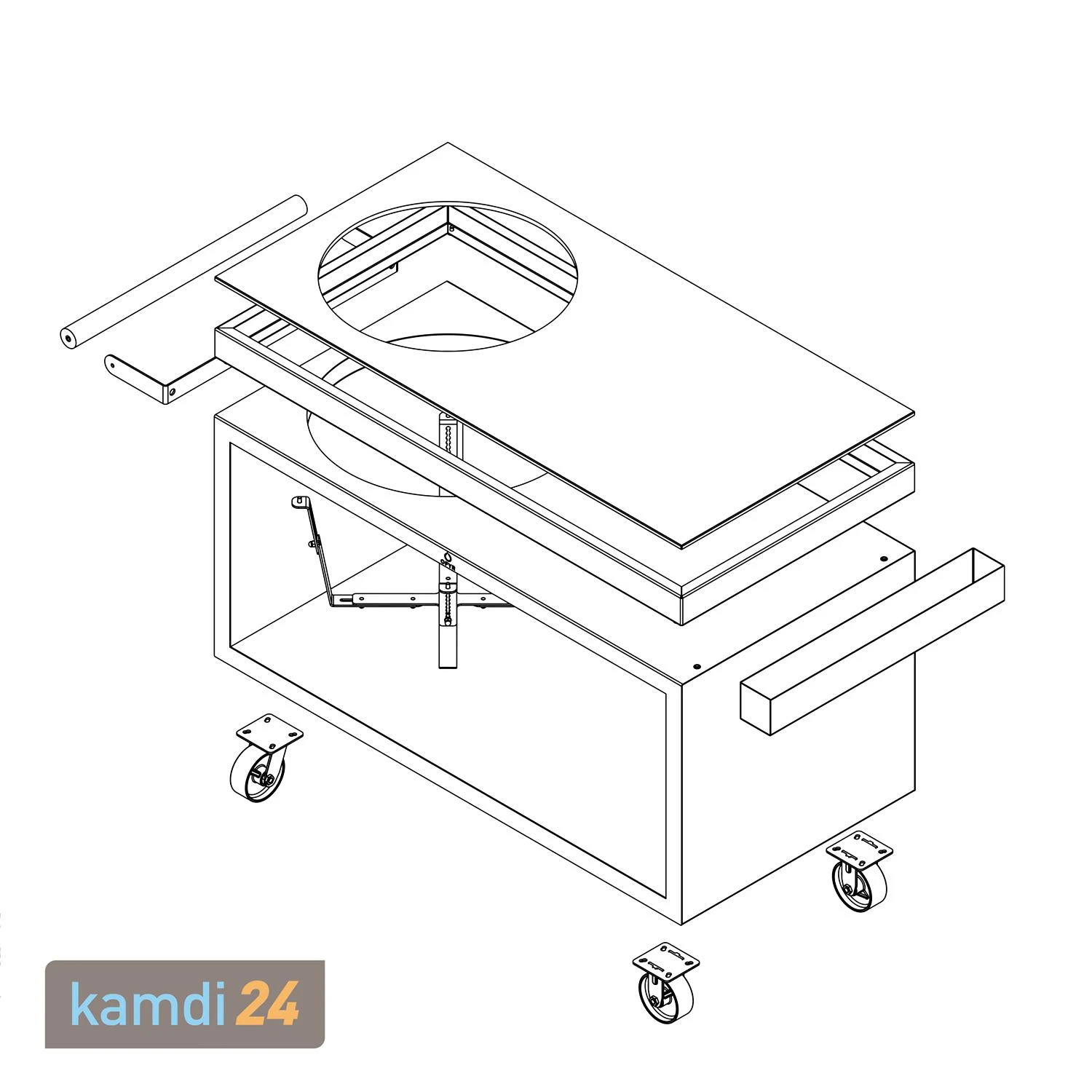 Als besonderes Merkmal zeichnet sich ein seitlicher Griff zum besseren Bewegen sowie als Ablage für Geschirrtücher und Grillbesteck aus. Zudem befinden sich unten vier Räder, mit denen du den Sockel leicht an verschiedenen Stellen im Garten platzieren kannst. Beachte, dass der Sockel mit Kamado sehr schwer zu bewegen ist.