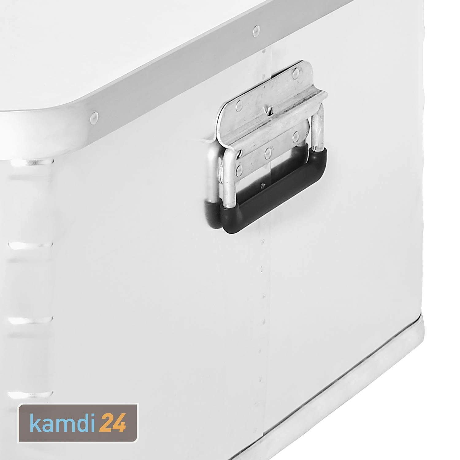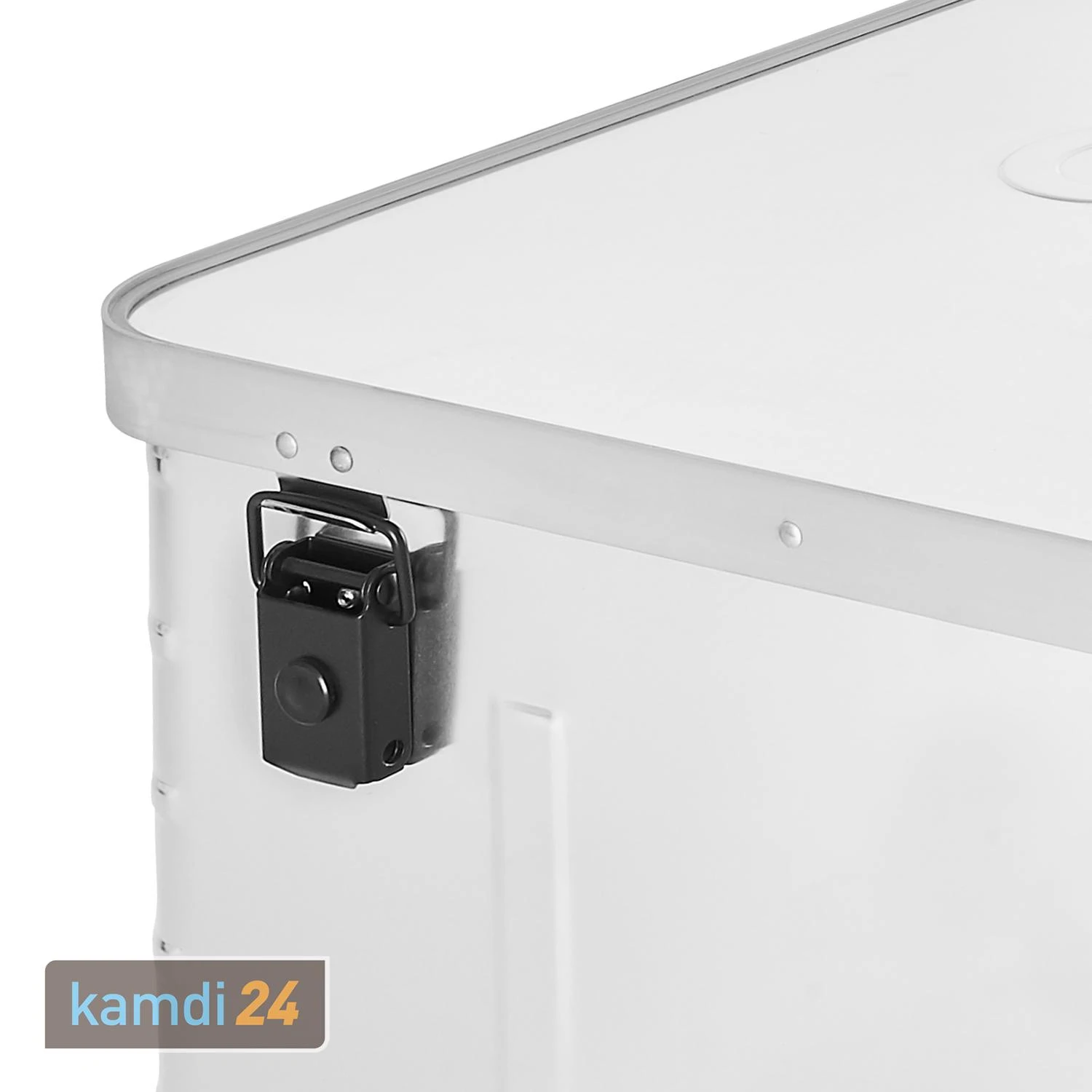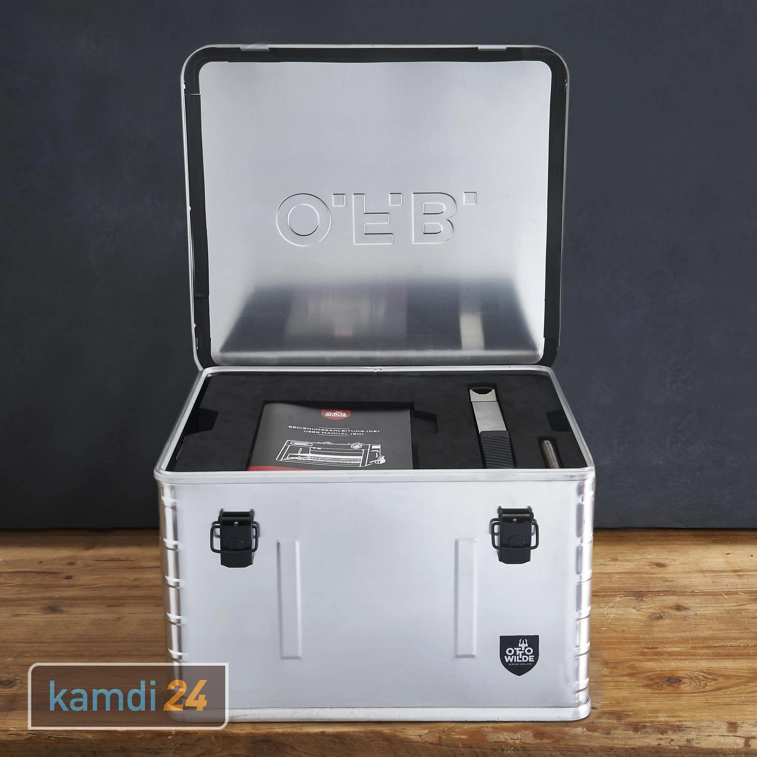 Die solide Box besteht aus Aluminium. Sie wird mit zwei Schnallen sicher geschlossen und kann mit den zwei seitlichen Griffen bequem getragen werden. Die silberne Box wirkt durch die schwarzen Applikationen der Schnallen und Griffe noch stylischer. Im Inneren ist die Box gepolstert und bietet neben dem Stauraum für den noch Platz für den Hebel und die Bedienungsanleitung. So können Sie alles an einem Ort aufbewahren.