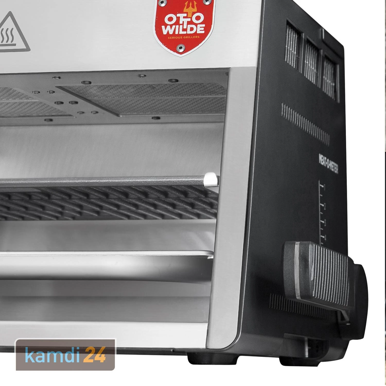 Durch seine zwei Infrarot-Gasbrenner erreicht der Brennertemperaturen von bis zu 900 °C. Die Hitze trifft von oben auf das Grillgut und sorgt für die Maillard-Reaktion, welche die Kruste goldbraun und kross und das Innere zartrosa und saftig werden lässt. Die hohen Temperaturen sorgen für kurze Garzeiten.