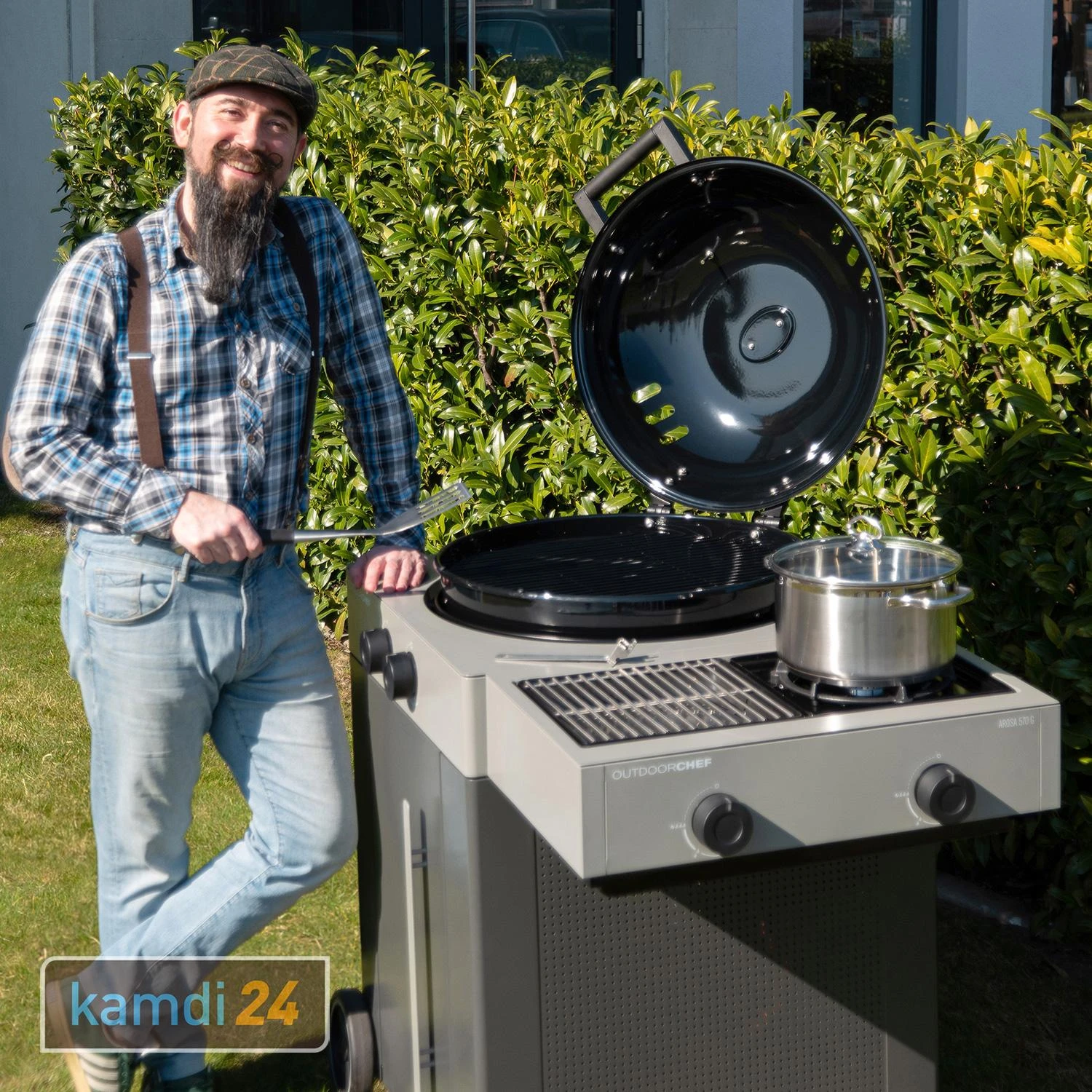 Das Zubehör wird an einer Seite anstelle der Ablage angebracht und umfasst zwei Funktionen: Die Blazing-Zone ist ein , der bis zu erreichen kann – ideal für Steaks und andere Fleischstücke. Auf der hinteren Cooking-Zone können Sie mit einem Topf oder einer Pfanne und mehr zubereiten.