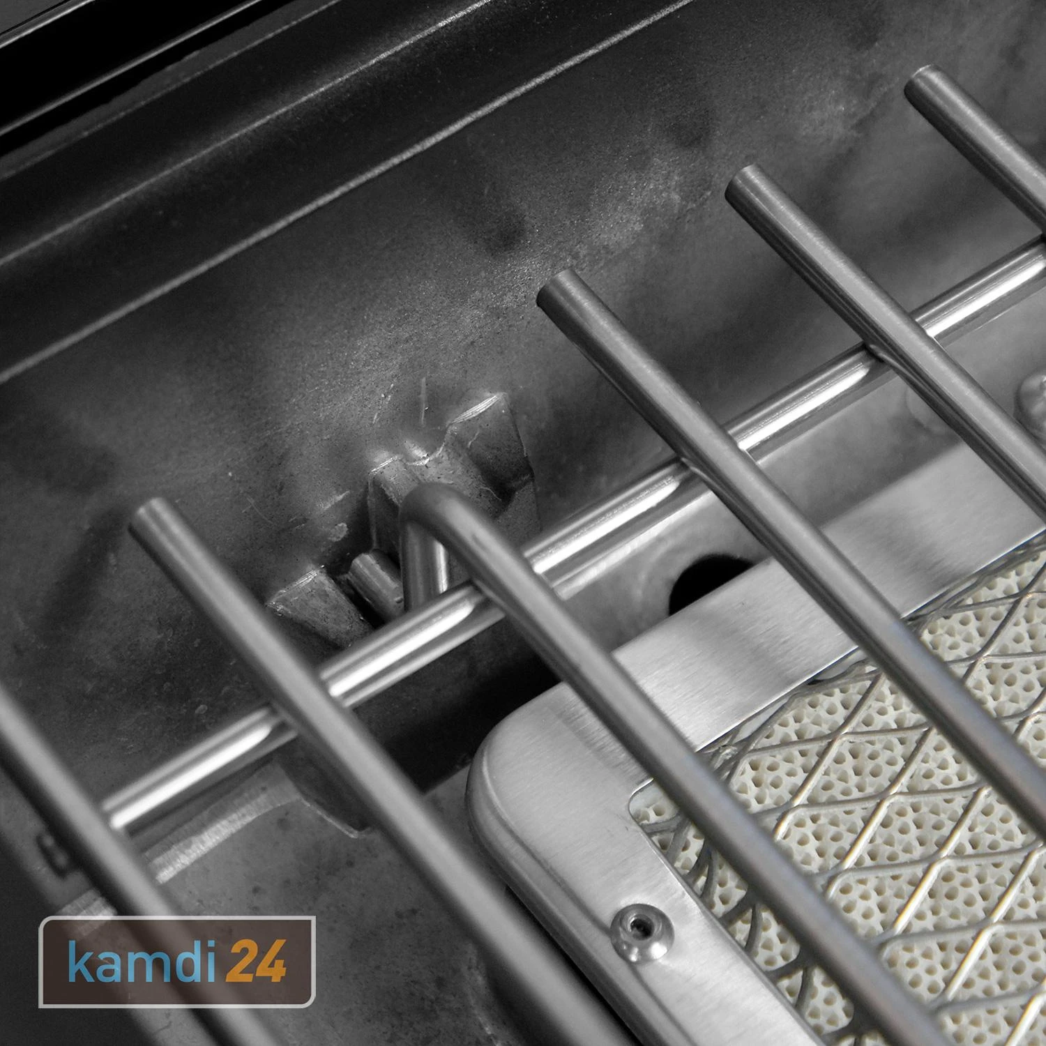 - Gusshalterung (Cooking-Zone) 3 Stufen; Rost (Blazing-Zone) 2 Stufen, jeweils höhenverstellbar