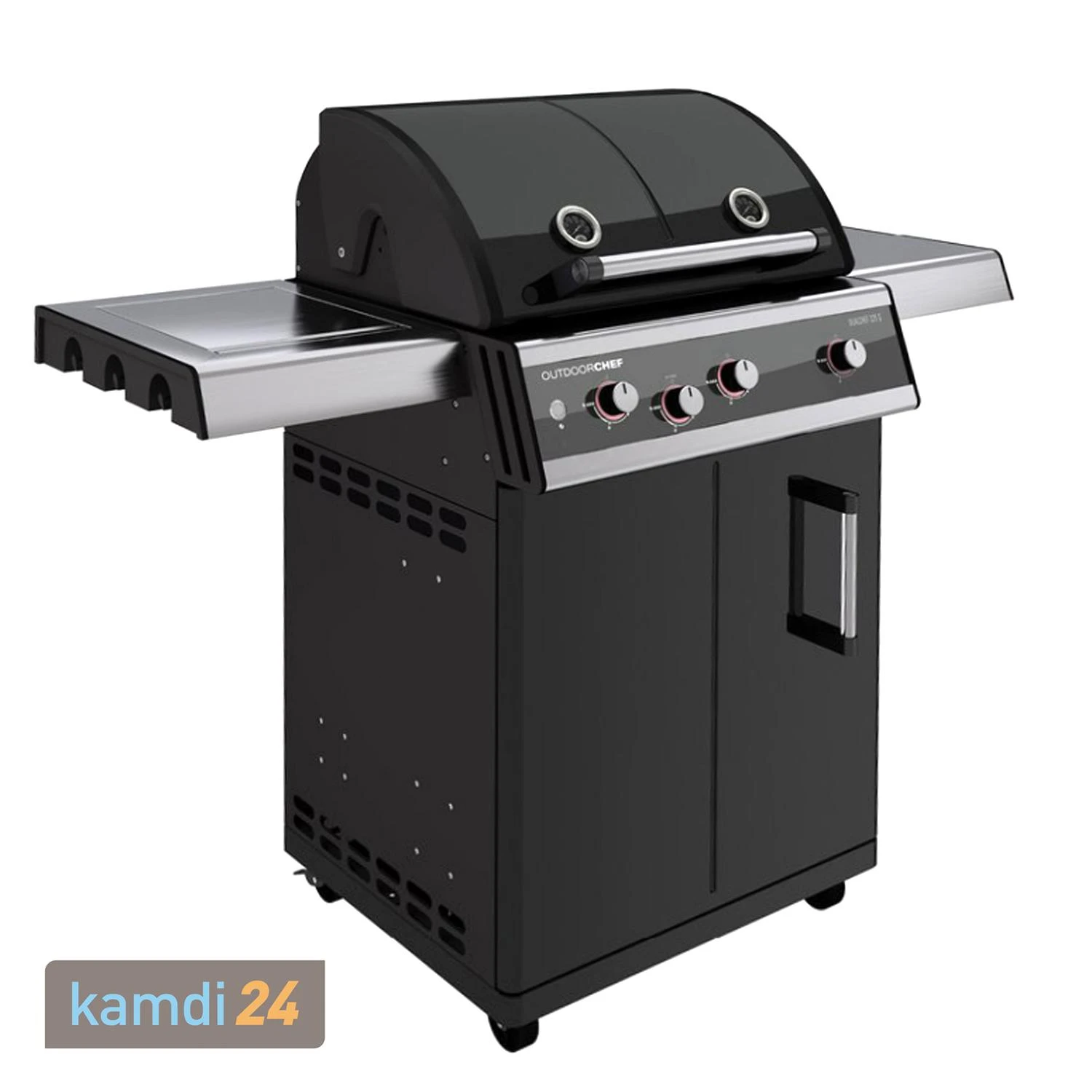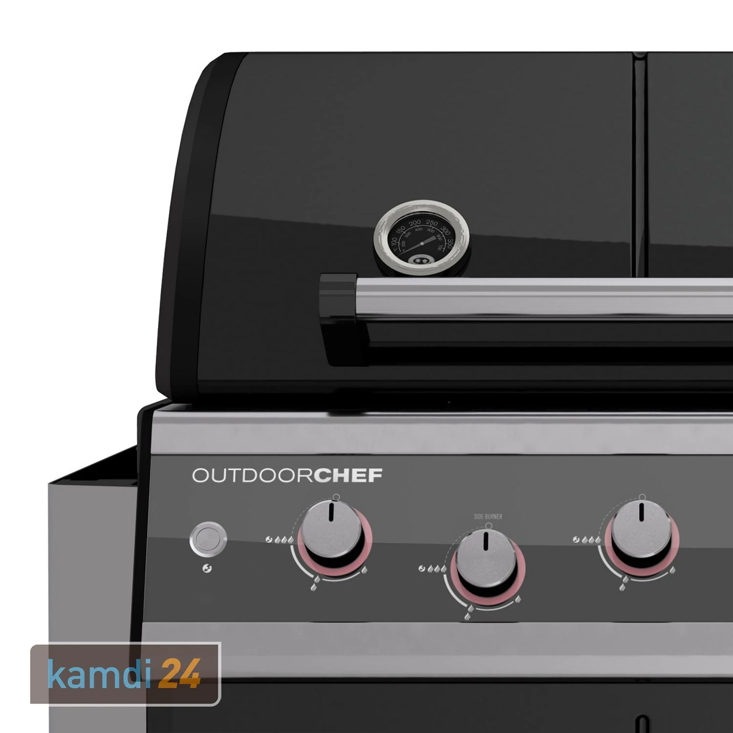Auch optisch hat sich Outdoorchef mit der selbst übertroffen. Schlicht, elegant und hochwertig ähnelt sie eher einer hochmodernen Küche als einer Grillstation. Eine in Glas eingefasste Bedieneinheit mit , und erzeugen eine ganz besonders hochwertige Optik. Der pulverbeschichtete Unterbau bietet genügend Stauraum für und weiteres . , zwei davon mit Bremsfunktion, ermöglichen ein problemloses Verschieben der Grillstation.