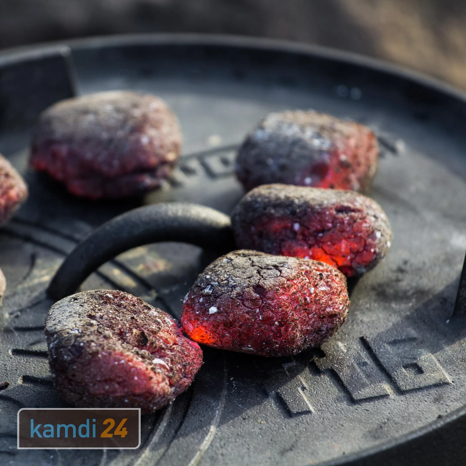 ist mit drei massiven Standfüßen versehen, sodass er auf einem Kohle-Bett nicht kippelt. Dank einer speziellen Vorbehandlung („seasoned finish“) ist der Feuertopf sofort einsatzbereit.