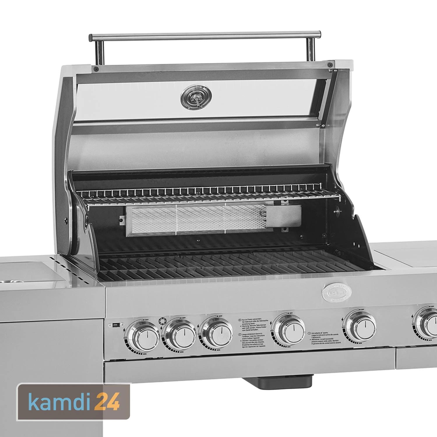 Holen Sie sich Ihre eigene Grillküche auf die Terrasse oder in den Garten: Die von bietet ausreichend Arbeitsfläche, Stauraum, ein integriertes Waschbecken und natürlich einen leistungsstarken . Das Allroundtalent verspricht eine unglaubliche Leistung von insgesamt 23,7 kW: Dabei sorgen auf der riesigen für ordentlich Hitze. Damit auch Grillgut am optional erhältlichen Drehspieß mühelos gelingt, verfügt über einen . Doch damit noch nicht genug, denn zusätzlich können Sie auf dem leckere Beilagen, Soßen oder Suppen zubereiten, während die bis zu 800 °C heiße Ihrem Grillfleisch im Handumdrehen die perfekte Kruste zaubert.