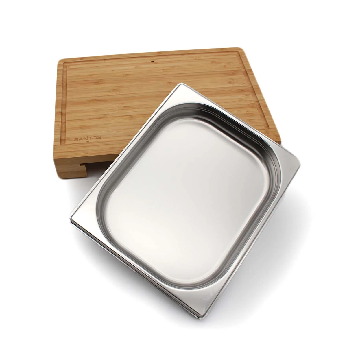 Die unter der Schneidefläche angebrachte Auffangschale lässt sich leichtgängig zu beiden Seiten herausschieben und erleichtert Euch ein sauberes und komfortables Arbeiten. Sie eignet sich zur Aufnahme von Schnittgut oder Abfall, welches so mit einem Handgriff entleert werden kann. Außerdem können Zutaten darin mariniert oder aufbewahrt werden, auch als Ofenform für Backofen und Grill ist die hochwertige Edel