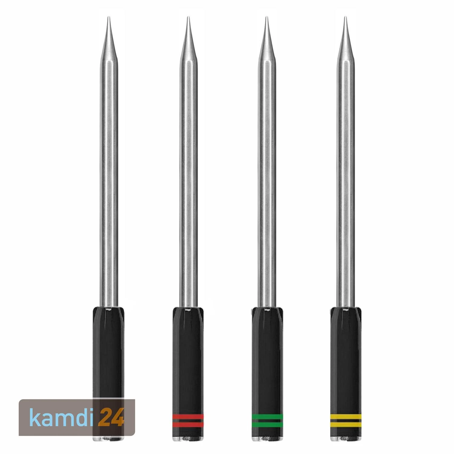 Es handelt sich hierbei um einen Einzelstick ohne Ladegerät, welcher der Ergänzung Ihres The MeatStick-Sets dient. Die App ist in der Lage, bis zu acht Temperaturfühler gleichzeitig auszulesen, sodass Sie auch in größeren Runden jedem Gast einen eigenen MeatStick zuordnen können. Die Griffe der Temperaturfühler sind wahlweise komplett in Schwarz oder in Schwarz mit roter, gelber oder grüner Markierung gestaltet. Treffen Sie Ihre Auswahl mit einem Klick über das Varianten-Menü.